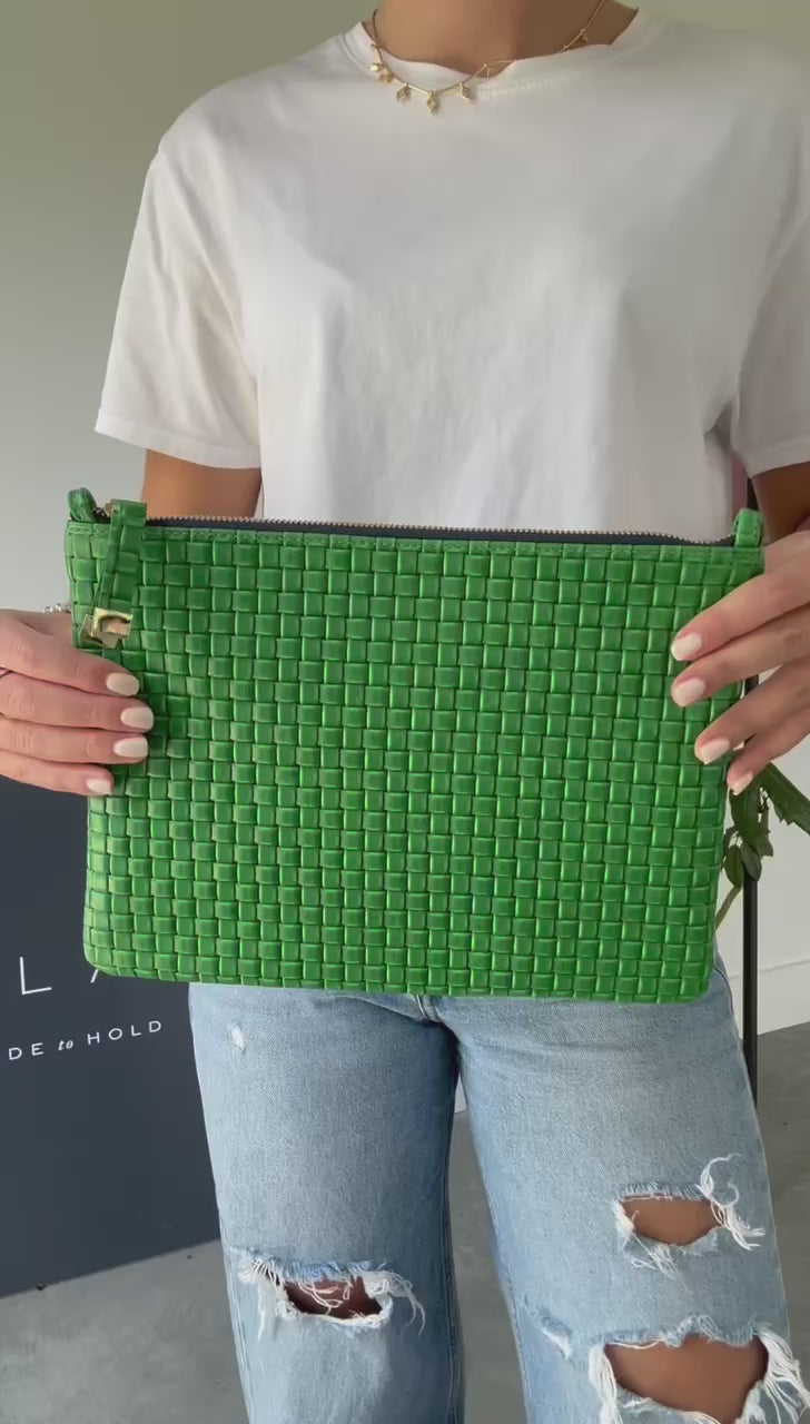 The Vale Pouch with Loops in Emerald Weave is a limited-edition bag that's both stylish and practical. Each bag features a unique embossed weave and comes in an eye-catching emerald green color.